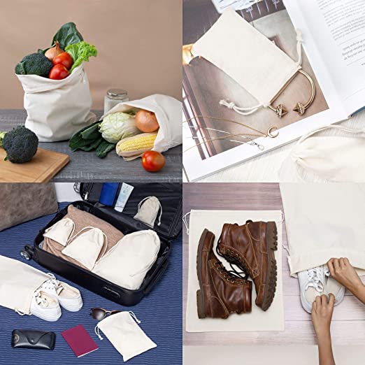- Material & Sizes - Made of 100% cotton with drawstring closure. Sizes available – 3x4, 4x6, 5x7, 10x12, 12x14 inches
